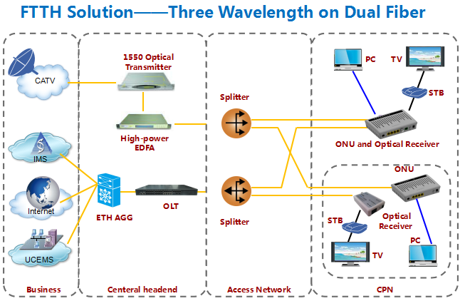 Uplink transmission rate:1.25GBPS Downlink l transmission rate:2.5GBPS Network coverage radius : 20 km Optical interface type:SC/PC Optical receiver with high sensitivity : ≥-28dBm Luminous power:1~4dBm |